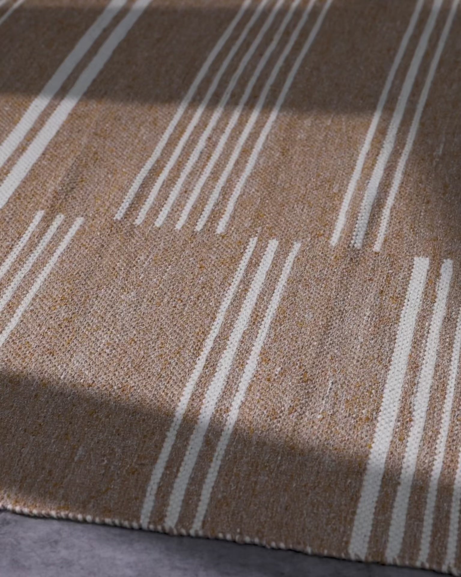 A perfect fusion of style and practicality, our flatweave Byron rug in Sand is our first ever reversable design with two distinct colourways on each side. Choose the side that best suits your design mood or aesthetic and enjoy the versatility of this wool/PET yarn blend design. Encompassing a coastal inspired linear pattern, our Byron rug will add a touch of modern flair to your home.
