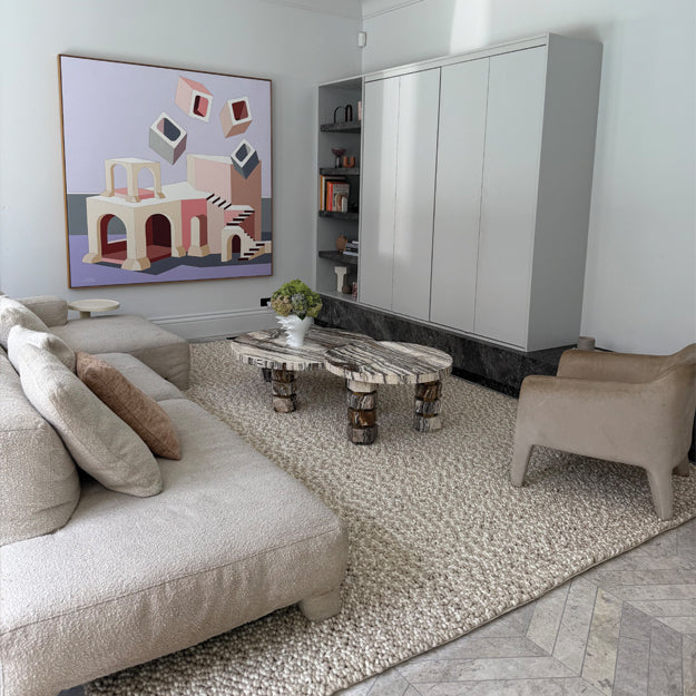 Its handwoven dual-layer design looped pile over a linear motif gives it subtle dimension and refined tactility.