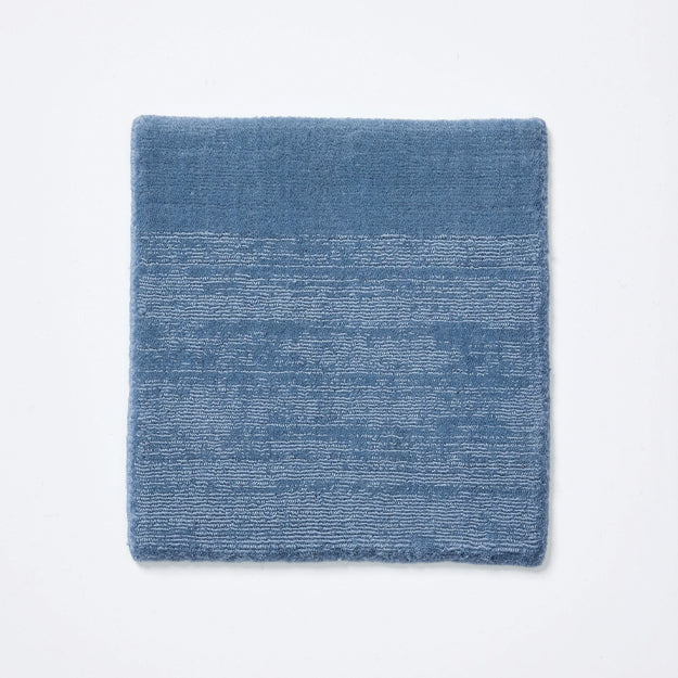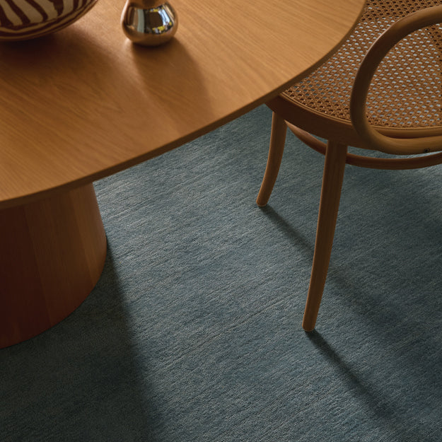 Its soft muted blue tone, hand-loomed wool, and tip-sheared texture create a calming, one-of- a-kind foundation for any space.